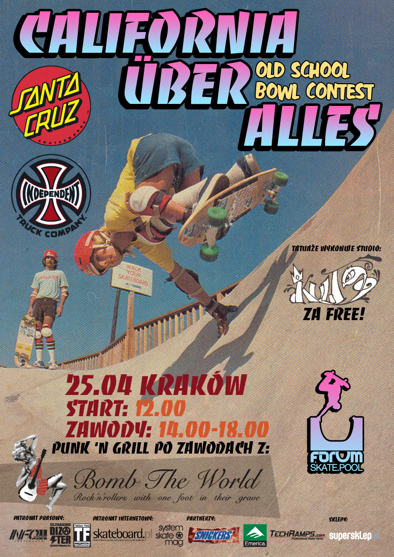 W najbliższą sobotę, 25 kwietnia, w krakowskim Forum Skate Pool odbędzie się impreza w klimatach 70-tych i 80-tych – California Uber Alles. Będzie więc jazda na deskach rybach, szerokich trakach z wielkimi kołami, stroje z tamtych lat, dobra muzyka i darmowe tatuaże w klimatach Santa Cruz i Independent.
