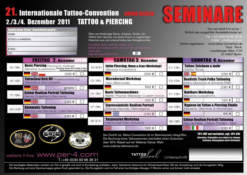 Podczas zbliżającej się berlińskiej konwencji tatuażu (2-4 grudnia) po raz kolejny odbędą się workshopy i seminaria dotyczące piercingu, bod modu i oczywiście tatuażu. Od piątku do niedzieli będą prowadzone bloki zajęciowe w trzech językach: po niemiecku, angielsku, ale również po polsku.